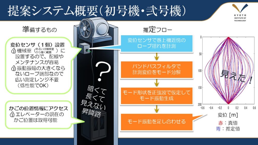 地震時の快適安全なエレベーター利用を目指して 地震時に地震時管制運転によりいったん最寄階に停止したエレベーターは、地震後においては機器に損傷がない限りすみやかに運転を再開させることが要求されます。エレベーターのリスタートは地震が収まってから経験的に十分な時間を待つことが通例ですが、エレベーターロープの揺れがリアルタイムに分かれば、もっと早くリスタートできるのではないでしょうか?私たちは200 m級のロープ全体の振動状態を機械室近傍の1つの変位センサーのみを使って推定する方法を提案しています。
